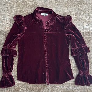Victorian styling. Frills in a feminine way, tracing the shoulders right down to the poet sleeves, while loop button closures finishes the piece on a romantic note.