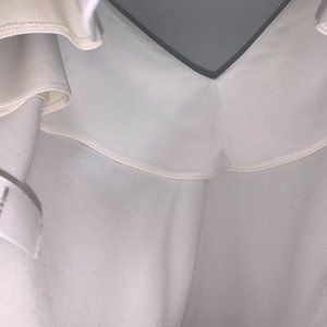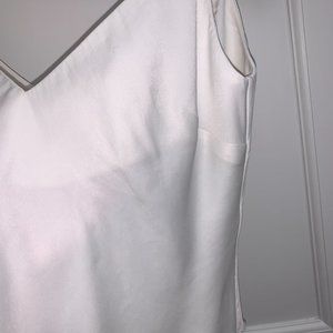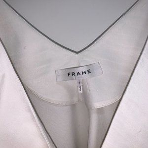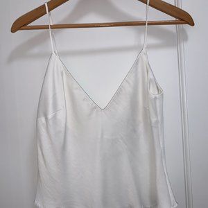 FRAME - white silky tank top / sleeveless top; adjustable spaghetti straps, raw fringe hem detail, partially lined on inside, V neck at front and back V as well, slightly cropped; cute going-out top, high quality and can definitely be dressed-up