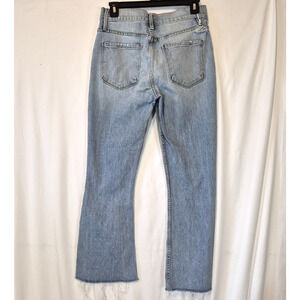 The FRAME Women's Heritage Sylvie Kick Boot Raw-Edge Jeans in Stunt 27 are a stylish and versatile addition to any wardrobe. Made from a comfortable cotton blend denim fabric with a raw wash, these jeans feature a solid blue color with a high-rise and a regular fit. The bootcut style and 5-pocket design add to the classic appeal of the garment, while the zip closure and button accents provide a secure and fashionable look. Perfect for all seasons, these machine washable jeans are a must-have for any woman looking for a timeless and trendy denim option.