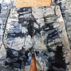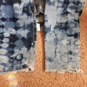 They feature a trendy acid washed denim with tie-dyed accents and a distressed design, giving them a modern and edgy look.
