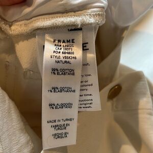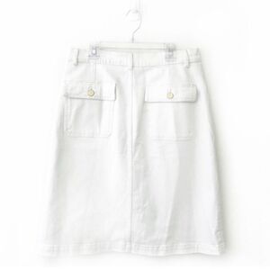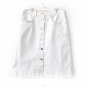 White / Off white Frame Denim knee length skirt with gold button closures down front. Has buttoned back pockets and front. Has stretch to it.