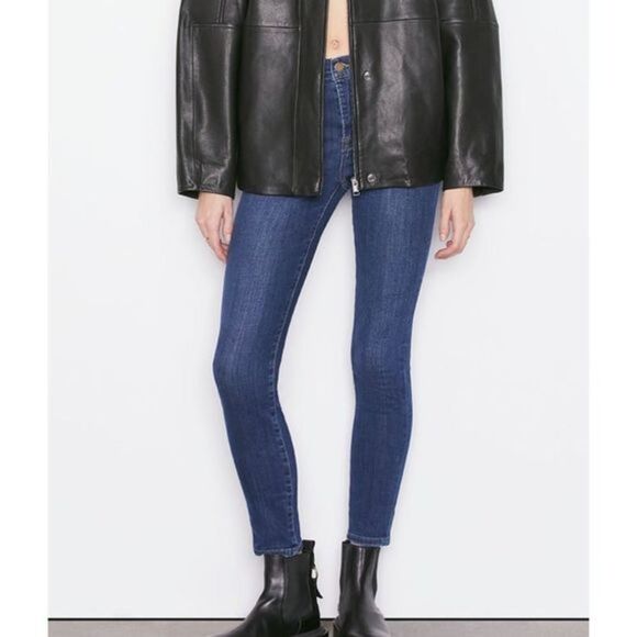 Dark wash/intentionally faded skinny denim. 8.5" rise, 26.5" inseam. Cotton, polyester, elastane blend. Great preloved condition! Size 24