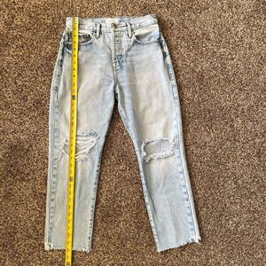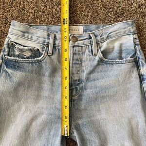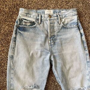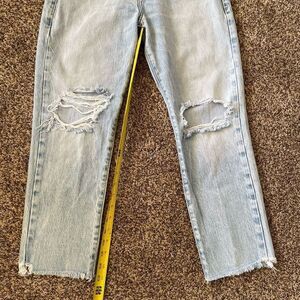 “Cropped straight-leg jean with a subtle slim silhouette and distressed details.