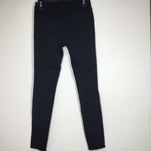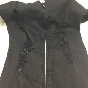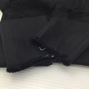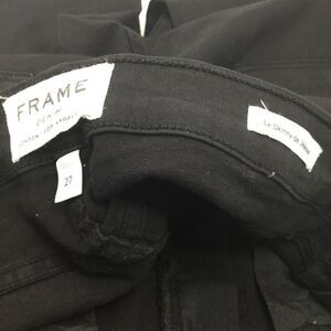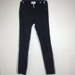 Super-stretch denim lends a curve-conforming fit to these monochrome FRAME jeans. Frayed holes and light fading break-up the deep wash. Raw hems. 5-pocket styling. Button closure and zip fly.