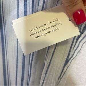 •Features: White and blue striped lightweight dress/cover up. Color is Blanc Multi. Fringe detail with tie to cinch the back.