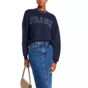 FRAME XXS Navy White Embroidered Block Letters Crew Cotton Blend Sweatshirt