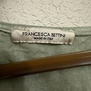 This beautiful Francesca Bettini blouse is perfect for any casual or travel occasion. The sage green color and bohemian style make it a great addition to any wardrobe. The blouse features a scoop neckline, short sleeves, and a relaxed fit, making it comfortable and breathable for the warmer seasons of spring, summer, and fall. The top is made of high-quality linen material, which is lightweight and comfortable to wear, and it comes in size L. The blouse has a unique design with patch pockets, making it both stylish and practical. It is perfect for those who love the beach, Lagenlook, or classic styles. The garment care instructions recommend hand washing only, and it is made in Italy. This blouse is a must-have for any woman who wants to add a touch of elegance and bohemian vibe to her wardrobe.