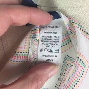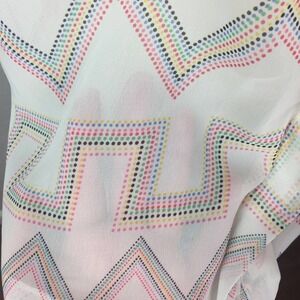 Features: sheer, pleat pattern down front of blouse, colorful dot pattern all over top, can easily be worn during any season!