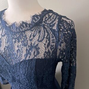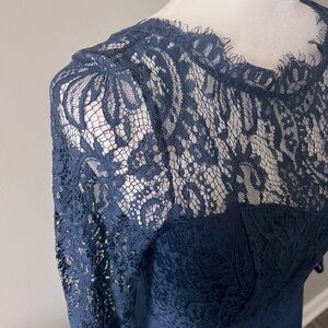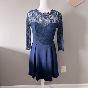 Francesca’s Collections dress. Navy blue. Sweetheart neckline. Upper neck and lace sleeves. 3/4 length sleeves. Back zipper and top clasp closure. Womens size medium.