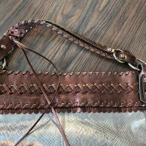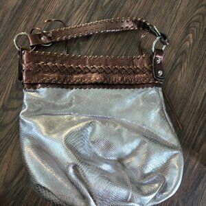 Absolutely stunning bohemian style, genuine leather silver metallic and brown hobo shoulder bag from FRANCESCO BIASIA. Very, very gently loved and in new/excellent quality and condition. Leather smells wonderful! Very spacious interior with FRANCESCO BIASIA logo fabric black lining. Two open side pockets and one zipper pocket. Zipper top closure. Silver hardware. Braided brown leather top with braided shoulder strap and fringe tassels. Base is a silver metallic leather snakeskin pattern. DIMENSIONS: 14" wide x 17" tall x 6" strap drop.
