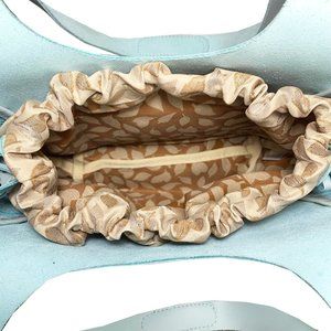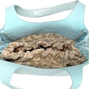- Tan fabric drawstring leaf motif lining with side drawstring pulls