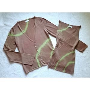 Soft & made from the finest softest cashmere + silk ever. The cocoa & kiwi hues are simply fabulous. Easy pull-on over head styling knit sleeveless top plus a matching over lay button-up cardigan. Femme slim-fit silhouette with a modern edge