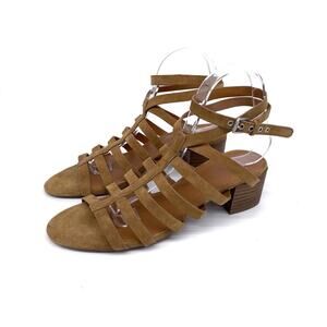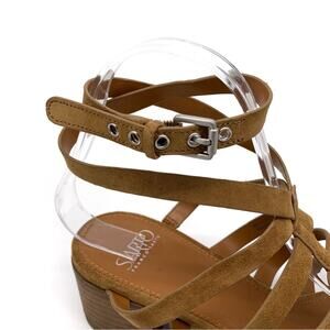 Franco Sarto Finesse Gladiator Cage Heeled Sandal in a medium tan. Suede leather upper, and a short, blocked stacked heel, with a rubber sole. Gladiator upper with an open heel and a wrapped ankle closure with a buckle. Fits best with a wide foot, as upper can be floppy - there are elastic strips along the edges for comfort. Great condition!