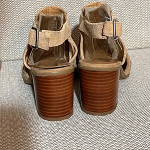 Tan leather woven open toe sandal by Franco Sarto size 6. Shoe has ankle strap with buckle closure and 3” block heel. EUC.
