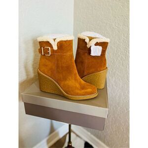 FRANCO SARTO Ulayna Water Resistant Suede Fleece Wedge Bootie Color: Whiskey Size: 8.5 NEW WITH TAGS ATTACHED Fuzzy high-pile fleece warms the interior of this chic ankle bootie fashioned with a water-resistant suede upper. 3 1/2" heel 4 1/2" shaft Water-resistant Leather upper/textile lining/synthetic sole Imported