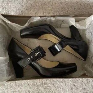 Designed By Franco Sarto. Women’s Size 6. Shiny Black Leather.Three-Inch Heels. Three Holed Silver Buckle With Stretchy Band. Great Condition With Original Box. Offers Welcome!