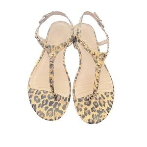 Scrappy animal print Sandler with gold stud t-strap and gold buckle.