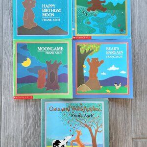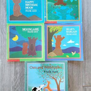 Frank Asch Lot of 5 Vintage Picture Books Moongame, Happy Birthday Moon, Bear's Bargain, Moongame, Bear Shadow, Oats & Wild Apples, in good to very good clean condition from a smoke-free home. No names, marks, writing, or torn pages. These were published in the '80s by Simon & Schuster and Scholastic. These would make an excellent addition to your child's learning to read book collection.