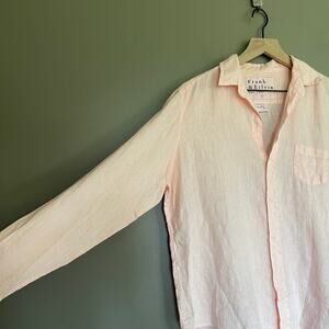 FRANK & EILEEN Eileen Relaxed Button-Up Shirt in Peach Linen, Size Small, Long Sleeves, Button Front, Relaxed Fit, Collar, In like new condition with no flaws or signs of wear.