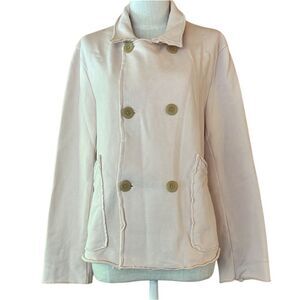 Triple fleece cotton jacket with front pockets, horn buttons, and waist hem detail .