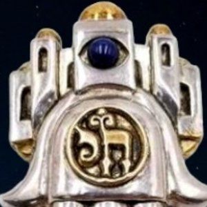 This Judaic good luck charm has an eye, made of Lapis lazuli, to ward off an evil eye. Silhouette of the walls of Jerusalem is found on top of the pendant, placing the word Hai in the center of the palm-shaped amulet. Made in sterling silver with gold plated elements.