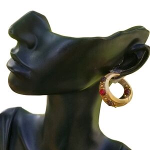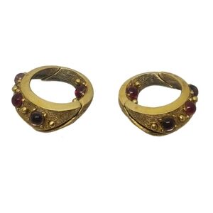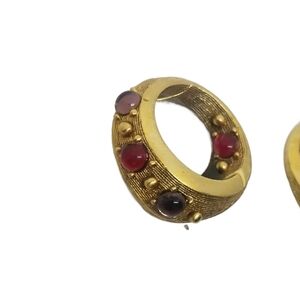 Unique vintage earrings by Tortolani jewelry. Earrings have a textured goldtone round wrap design set with jewel color glass cabachons. Earrings have a hinge opening at top for a clip on style effect. Earrings measure approx. 1-1/8 inches in diameter and are stamped tortolani. Excellent condition.