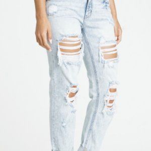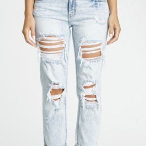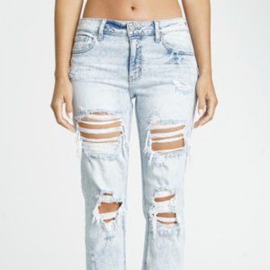 FRANKIE LOW RISE GIRLFRIEND WITH HEAVILY DISTRESSED DETAILS, ROLLED HEM, AND FIV