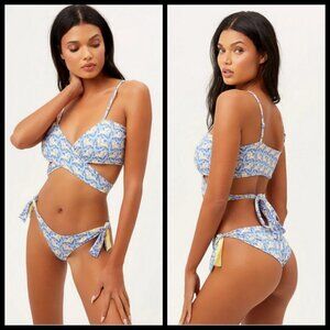 The Frankies Bikinis Falcon Top in the dreamy monarch print is the newest wrap around bikini top. Built with a classic silhouette that wraps around the front and ties in the back for an adjustable fit. Feminine and sporty all in one, this bikini top is complete with a luxe swim fabric. The perfect butterfly vacay look!