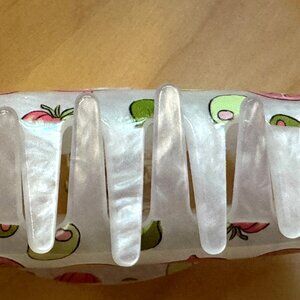 Add more veggies to your hair accessories! This crescent shaped claw in a soft pearlescent luster with a colorful bounty of veggies will add flair to your hair. Three Quarter Inch teeth will keep your 'do securely in place for effortlessly bold styling. This medium sized hair claw is recommended for all hair types and textures, whether fine bun or thicker hair half-updos.