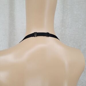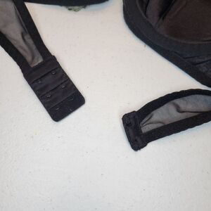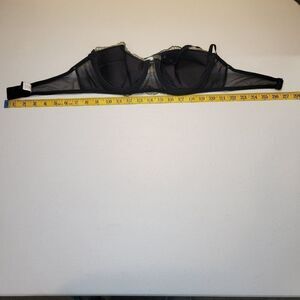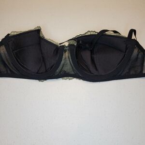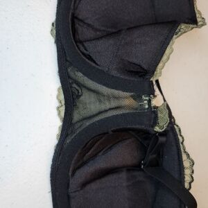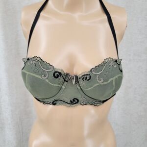 Black with green mesh overlay and embroidery details. Halter style strap, padded underwire. No wear to hooks or wires.