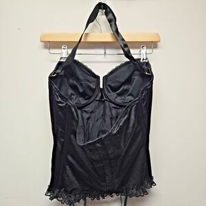 FREDERICK'S of Hollywood SEXY Corset sz 38 Black Teal Bows Whimsygoth 90s Y2K