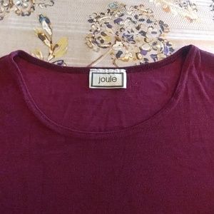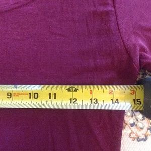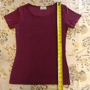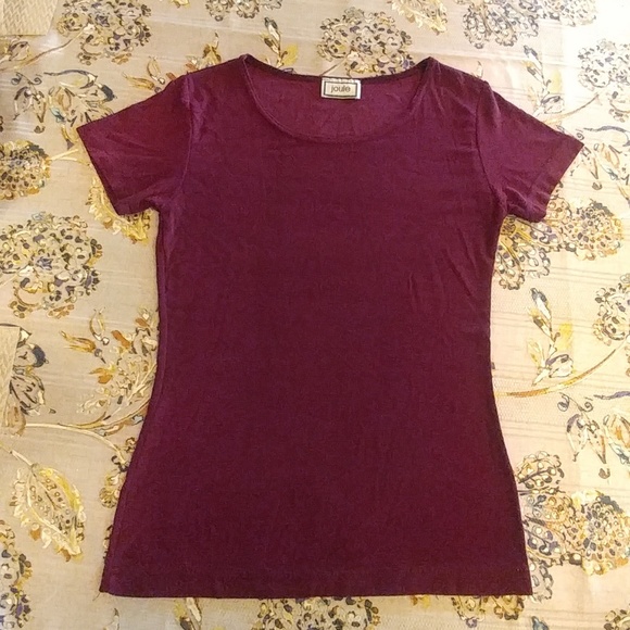 This shirt is very stretchy. Fits like a medium. Form fitting though. It is burgundy in color.