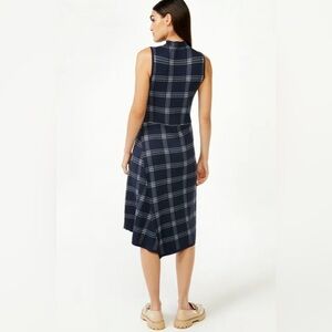 This chic Free Assembly sweater dress, size L, showcases a sleeveless design with a mock neck, ideal for both casual and work occasions. The blue and white plaid color palette enhances its classic appeal, while the midi length offers a sophisticated touch. A versatile piece that seamlessly blends style and comfort.