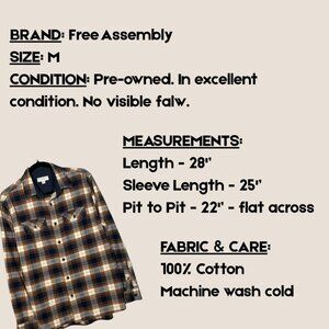 FREE ASSEMBLY Men Size M Flannel Shirt Plaid Cotton Long Sleeve Fall