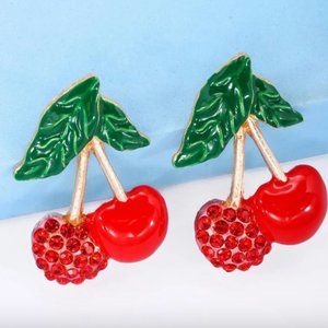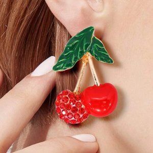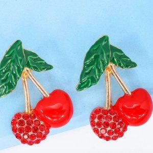 ⭐️❤️ FREE Cherry Rhinestone Boho Peasant Chic Fruit Leaf Glam Hipster Earrings