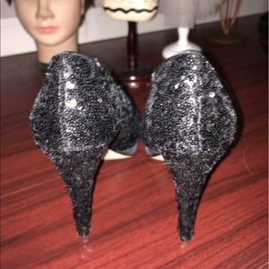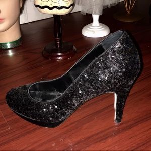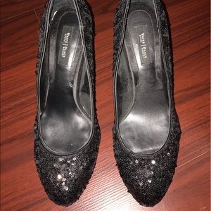 WHITE HOUSE/BLACK MARKET BLACK SEQUIN PUMPS 👠 WITH 4 INCH HEELS N BLACK SATIN 1/2 INCH PLATFORMS ..EXCELLENT EXCELLENT CONDITION SIZE 8M