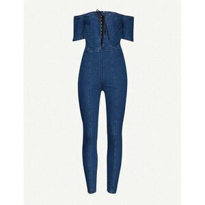This timeless denim jumpsuit from 3x1 is featured in an off-the-shoulder design with lace front detail and yoking feature throughout in a tapered leg silhouette.