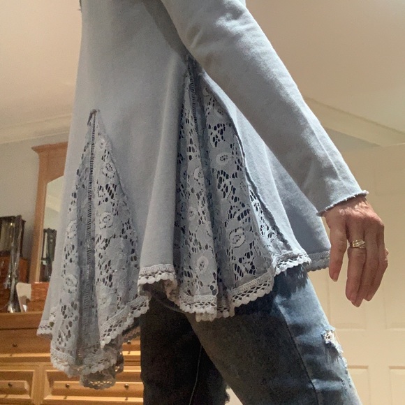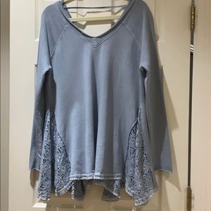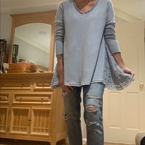 This is such a great tunic style top. Perfect with skinny jeans or leggings. The panels are lace with a raw edge v-neck line and sleeve. It’s sweatshirt material. Perfect fall transition piece. I love this top. It’s typical Free People and oversized. The color is a grey blue.