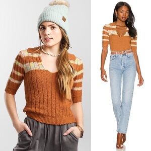 FREE PEOPLE 70s Cropped V-Neck Chunky Knit Striped Short Sleeve Henley Sweater S