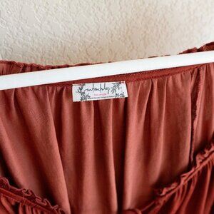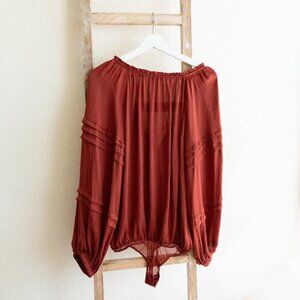 FREE PEOPLE ALL TUCKS BODYSUIT SZ L TERRACOTTA PEASANT RUFFLES TASSELS BOHO