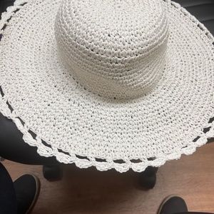 Features: Crochet fabrication, wide floppy brim, rounded crown, scalloped edges