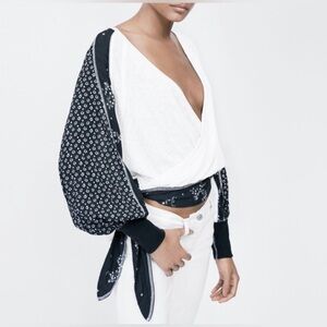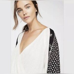 NWT FREE PEOPLE Auxton Thermal Wrap Kimono Thermal Top. FP Size Large XS. Retail price $98. Black Ivory White Bandana Floral. Lightweight waffle knit thermal featuring contrast printed raglan sleeves and side tie waist. Surplice deep v neck neckline. Side tie waist. Slouchy oversized silhouette.