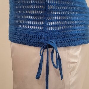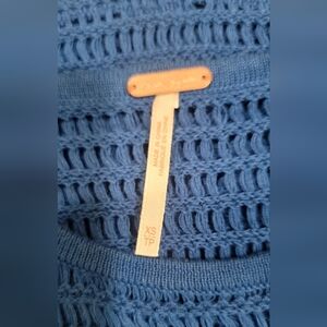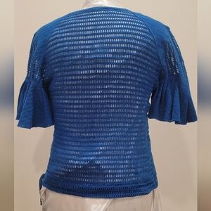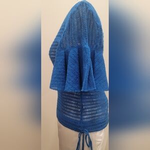 Free People Babes Only cobalt blue open knit top. There is a drawstring at the hemline. The sleeves are ruffled. Measurement from underarm to underarm is 15". Please see all pictures.