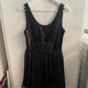 Gorgeous velvet and chiffon mini dress. Chiffon bottom and pleated detailing at front of waist. Ties at front of waist. Lined.