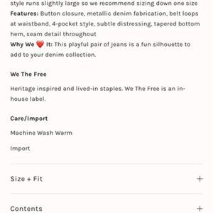 Description: Our top-rated Good Luck jeans, now with a bold metallic finish! These barrel jeans from our We The Free collection are featured in a mid-rise fit with subtle distressed detailing and wide-legs that taper at the ankle.