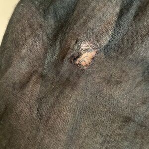 Small hole in the under layer of dress (the slip part). Isn’t visible while wearing.