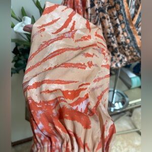 Embrace a bohemian vibe with this stylish orange and black top with long tie dye look puff sleeves with an elastic waistband.Perfect for casual outings, it features a unique pattern that stands out. Pair it with your favorite jeans for a chic look. Oversized could fit a S-M also. Measurements are 20.5” ptp, length 20”