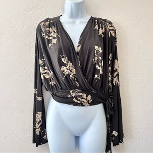 FREE PEOPLE Bell Sleeve Wrap Top Waist Tie Brown Cream Flowy Blouse Size XS