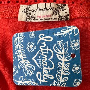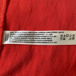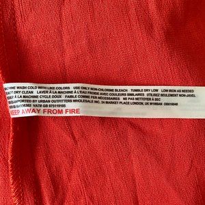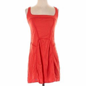 Adorable dress! Red-ish orange. Scoop neck. Fit/flare silhouette. Comfortable (stretch). Sleeveless. Unlined. Crochet trim. Pullover styling.