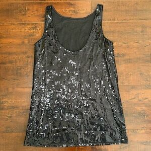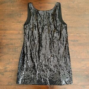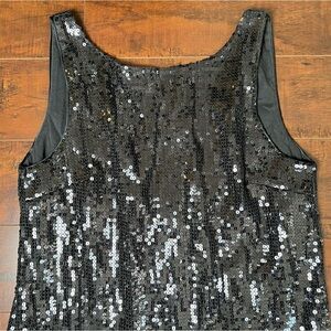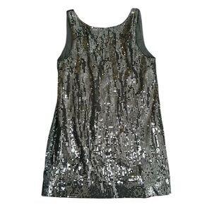 Pullover styling with sequins throughout. Loose fitting shift silhouette, lined. Excellent pre-owned condition, no flaws.